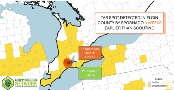 The first scouting report of tar spot in Ontario corn was on July 14, 2025, in Elgin County. This aligns closely with previous years.